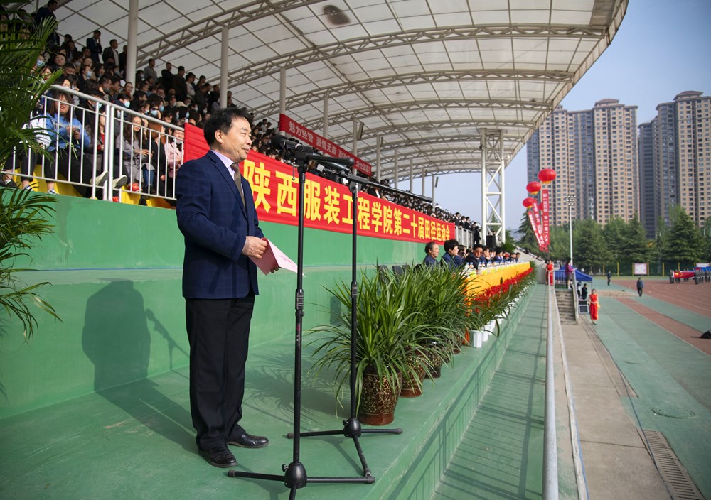陕西服装工程学院校长张义明教授致开幕辞。张校长代表学校对本届运动会的成功举办表示热烈的祝贺!向筹备这次运动会的全体工作人员表示衷心的感谢!向参加运动会的全体运动员、教练员、裁判员表示诚挚的慰问!