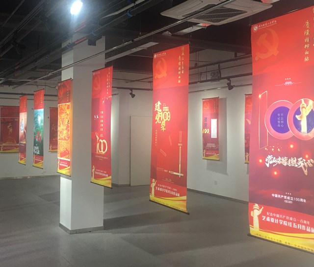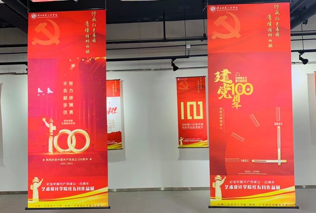 近100幅参展作品主要以师生联展为主,集合招贴设计、摄影、剪纸等多种艺术形式与党史元素进行完美融合,内容以庆祝中国共产党成立100周年为核心,以美为媒,充分展示师生的聪明才智、艺术设计天赋,用现代美术艺术表达感恩祖国、感恩党的主题,凸显思政课程、课程思政的实施效果及党史学习教育成果,用自己的方式向党的生日献礼。