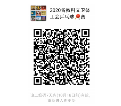 各直属基层工会: 为认真落实陕西省“全运惠民”工程,在教科文卫体系统营造“全民全运,全运惠民”的浓厚氛围,省教科文卫体工会决定举办以“我要上全运”为主题的 2020 年陕西省教科文卫体系统职工乒乓球团体比赛。现将有关事项通知如下: 一、主办及承办单位 主办:陕西省教科文卫体工会 承办:陕西铁路工程职业技术学院 二、比赛时间及地点 时间:2020 年 10 月 22 日至 23 日,21 日报到,23 日返程。 地点:陕西铁路工程职业技术学院高新校区文体中心。 地址:渭南市高新技术开发区科教园区胜利大街西段。 领队会时间地点:2020 年 10 月 21 日 16:30,陕西铁路工程职业技术学院高新校区北三楼会议室。 开幕式时间地点:2020 年 10 月 22 日 8:00,陕西铁路工程职业技术学院高新校区文体中心。 三、报名要求 1.陕西省教科文卫体工会各直属基层单位,以单位名义组队参赛。每单位限报 1 个参赛队,每队队员 4 名,每个参赛队派领队 1 人、教练 1 人。根据队员情况,每队可报男、女替补队员各1 名,每支代表队含领队、教练、队员、替补队员最多不超过 8人。 2.参赛队员须由本单位人事部门(工会)开具在职证明,在职证明内容需包括参赛队员姓名、身份证号、工作部门、具体职务(岗位)等,并加盖公章。 3.所有参赛人员必须是身体健康者并适宜参加此项赛事,由校医院或县级以上医院出具健康证明。 4.领队、教练、工作人员、运动员均需由参赛单位办理往返交通和比赛期间“人身意外伤害保险”。 5.赛前 14 天内有与中高风险地区人员、境外人员、确诊或疑似新冠肺炎患者接触史,或有发热、干咳、呼吸急促、呼吸困难等身体不适症状人员,不允许报名参赛。 四、参赛资格 1.参赛队员必须为本单位在职员工,兼职、派驻、借调、返聘等人员不得参加。 2.有下列经历之一者,不得报名参赛: (1)在国家体育总局全国运动员注册系统有过注册记录的乒乓球运动员; (2)在各省、自治区、直辖市、计划单列市、解放军、行业体协等体工队有过正式编制(含领取津贴)的乒乓球运动员; (3)参加过全国计划内 16 岁以上组乒乓球比赛; (4)在国际乒联有过注册记录的乒乓球运动员; (5)参加过国际乒联、亚乒联盟等授权或主办的乒乓球职业赛事的运动员。 3.参赛队员每场次赛前应交验身份证。 五、比赛办法 1.比赛采用混合团体赛形式进行,采用 3 场 2 胜制,每场比赛每名运动员只能出场一次,出场顺序为:男单、混双、女单。每场比赛采用 5 局 3 胜,每局 11 制; 2.混合团体赛第一阶段采用分组单循环,小组前 2 名进入第二 阶段,第二阶段采用单淘汰方式进行; 3.比赛使用新材料红双喜牌三星 D40+mm 白球; 4.竞赛执行国家体育总局审定的最新《乒乓球竞赛规则》; 5.比赛迟到 15 分钟,按弃权处理; 6.参赛运动员服装主体颜色不能为白色; 7.本次比赛运动员禁止使用违规器材,胶皮须有国际乒联认证标志,违者取消比赛资格; 8.混合团体赛第一阶段比赛顺序,由上届比赛成绩设定种子队,第二阶段抽签于第一阶段比赛结束后抽签。 六、奖项设置及奖励办法 本次比赛取前 16 支参赛队伍进行奖励,设一等奖 1 名,奖金3000 元;二等奖 3 名,奖金 2500 元;三等奖 4 名,奖金 2000 元;优秀奖 8 名,奖金 1500 元。另设特别贡献奖 1 名,优秀组织奖若干名。 七、其它事宜 1.报名截止时间:2020 年 10 月 16 日 16:30,请各单位于10 月 16 日前将报名表(附件一)及参赛队员在职证明、健康证明、保险单据(照片或扫描件)打包发送到 149445106@qq.com; 2.各参赛队食、宿、交通费用自理。承办方将联系协作宾馆,在微信群内公布,各参赛队自行联系订房; 3.未按要求参加领队会、开幕式、闭幕式的单位将取消“优秀组织奖”评选资格; 4.开、闭幕式及正式比赛期间,各参赛队伍应统一着装,按时参加,所有参赛人员着运动鞋进入比赛场地; 5.请各参赛单位领队或指派专人扫描文件下方二维码,加入“2020 年省省教科文卫体工会乒乓球赛”微信群(扫描下方二维码),以便及时接收最新通知。