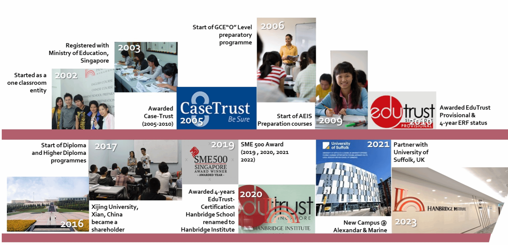 新加坡汉桥学院成立于2003年,是新加坡私立教育委员会教育信托(EduTrust)四年认证的知名高等教育学府。并于2021年3月,由新加坡教育部技能创前程委员会(SSG)指定为新加坡职业技能资格证书(WSQ)培训中心。自2003年成立至今,汉桥学院已经发展成为一所覆盖7岁到70岁全年龄段教育的综合高等院校,目前学校提供AE1S和新加城剑桥“0”水准预备课程,英国萨福克大学本科、硕士课程,大学生海外交换课程,WSQ课程和教师培训及学生游学、研学项目。学校长久以来的办学宗旨是不断优化学术团队,提升教学质量,以保障学生们顺利地考入自己理想的目标院校。汉桥学院自创立以来坚持为学生提供卓越的教育和支持,以帮助他们实现成功的学业和职业发展。