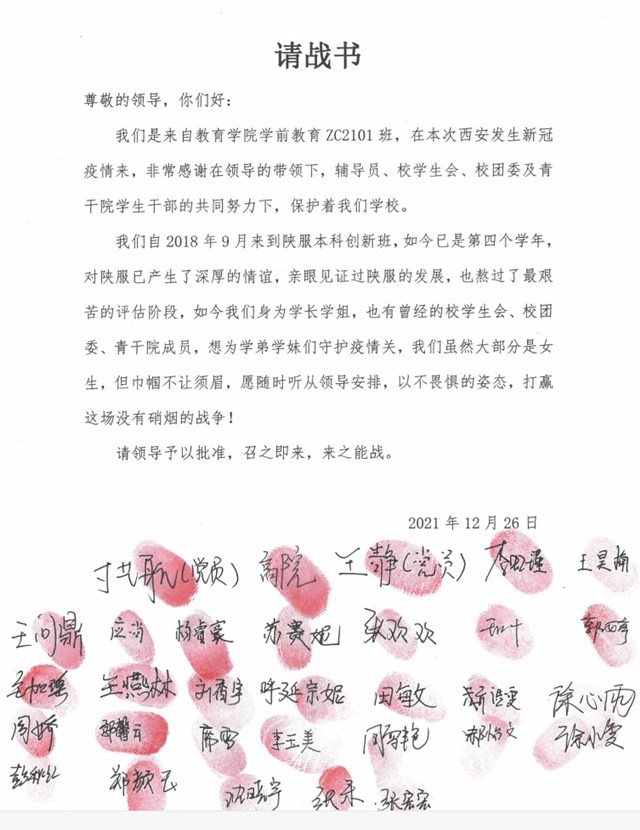 陕服新闻网讯(李文斌)西安当前的疫情形势严峻复杂,在伟大“抗疫精神”的感召下,陕西服装工程学院一群活泼可爱的教育学院学生,郑重向学校呈上了“请战书”,表示他们“愿意随时听从组织安排,以不畏惧的姿态,召即来,来能战”。他们当中大部分是女生,巾帼不让须眉,当代大学生勇于担当奉献的精神风貌由此可见。