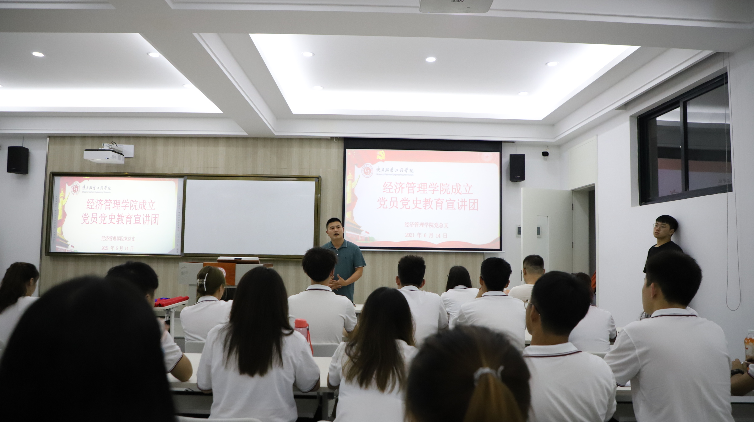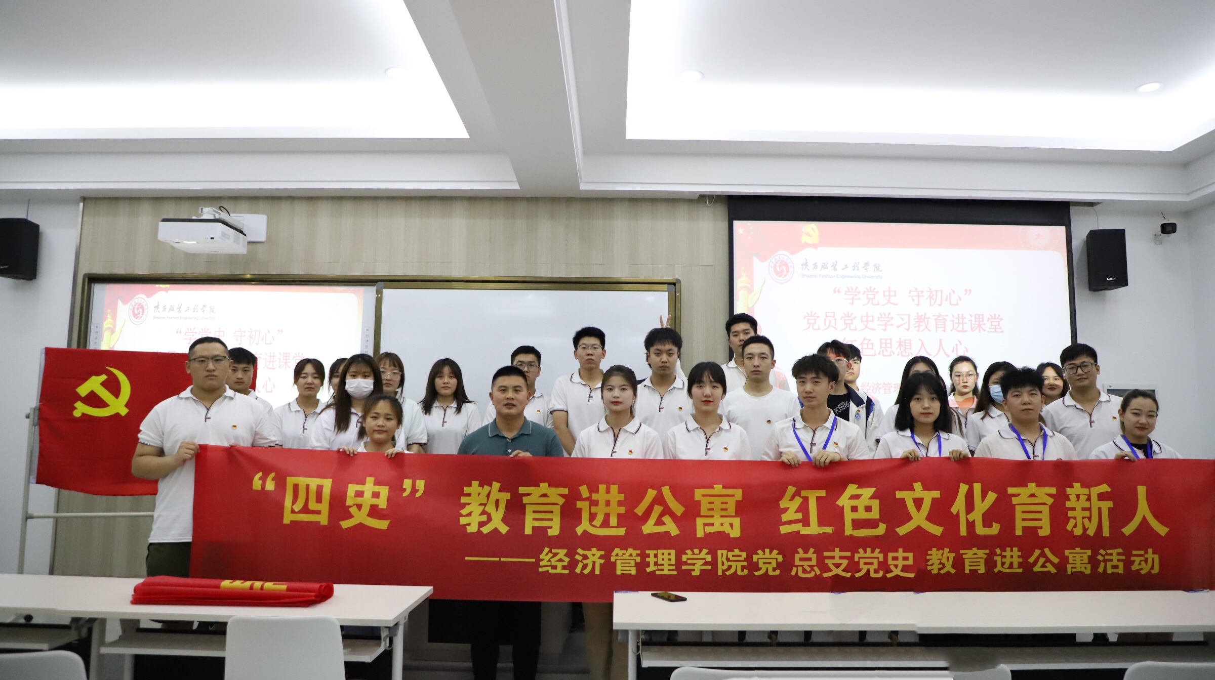 陕服新闻网讯(郭亭亭)6月15日,学生钱杏、学生康航、学生付格格等组成的党史宣讲团在6号楼521宿舍、10号楼402宿舍及6号楼519宿舍进行宣讲。本次活动的主题是“四史教育进公寓、红色文化育新人”。