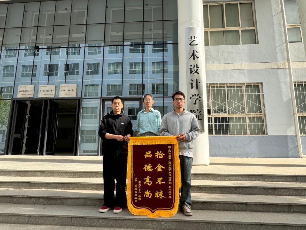 陕服新闻网讯(高岚)4月10日下午,一面写有“拾金不昧 品德高尚”的锦旗被送至我校,以此表彰我校艺术设计学院播音与主持艺术专业2022级学生赵国庆、刘恒、李佳豪三人拾金不昧的高尚行为。失主李慧女士及其家人携锦旗亲临学校致谢,艺术设计学院执行院长时晓楠及学生代表共同接受赠旗。