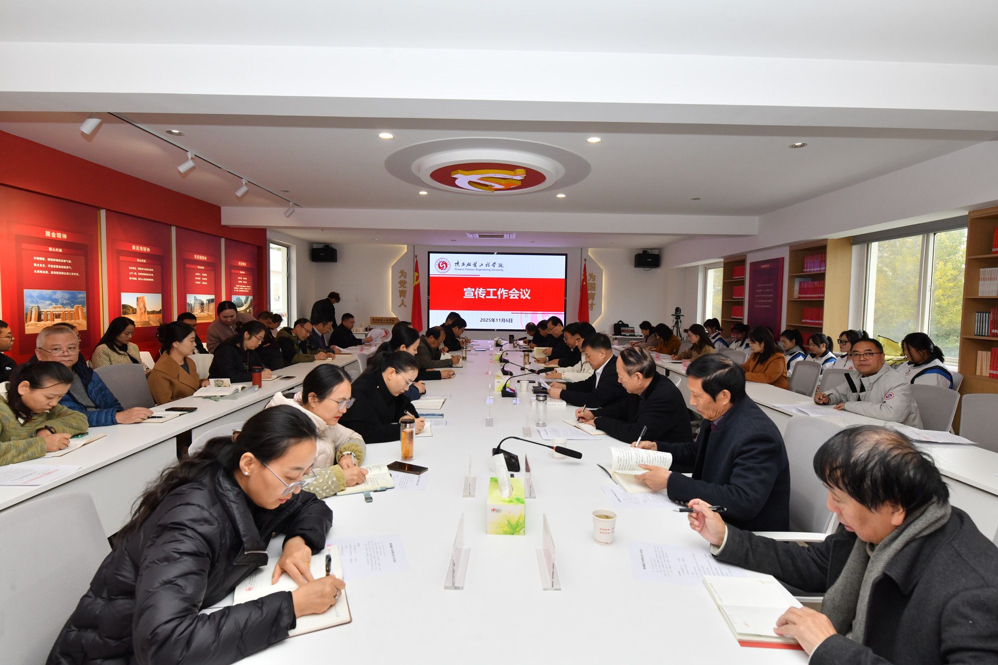 陕服新闻网讯(李文斌)11月6日上午,学校在行政楼326会议室召开宣传工作会议,贯彻落实党的二十大和二十届三中、二十届四中全会精神,深入学习贯彻习近平文化思想,全面总结回顾学校2023年以来的宣传工作,表彰宣传工作先进集体和个人,交流经验,分析形势,进一步统一思想,明确目标,推动我校宣传工作再上新台阶。董事长吕明、党委书记王岗出席会议并讲话。党委副书记刘继兵作学校宣传工作报告。校级领导、党委委员、纪委委员出席会议。副董事长、党委副书记、副校长吕超主持会议。