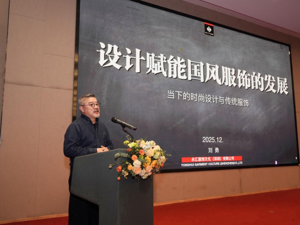 中国时装设计金顶奖(两次)获得者刘勇以《设计赋能国风服饰的发展——当下的时尚设计与传统服饰》为主题,用国潮概念切入,探讨了传统服饰元素在当代时尚设计语境中的创新应用,强调商品设计需要解决的三大核心问题即特点、色彩、纹样。国风服饰设计作为核心驱动力,对文化传承与焕新的重要意义。