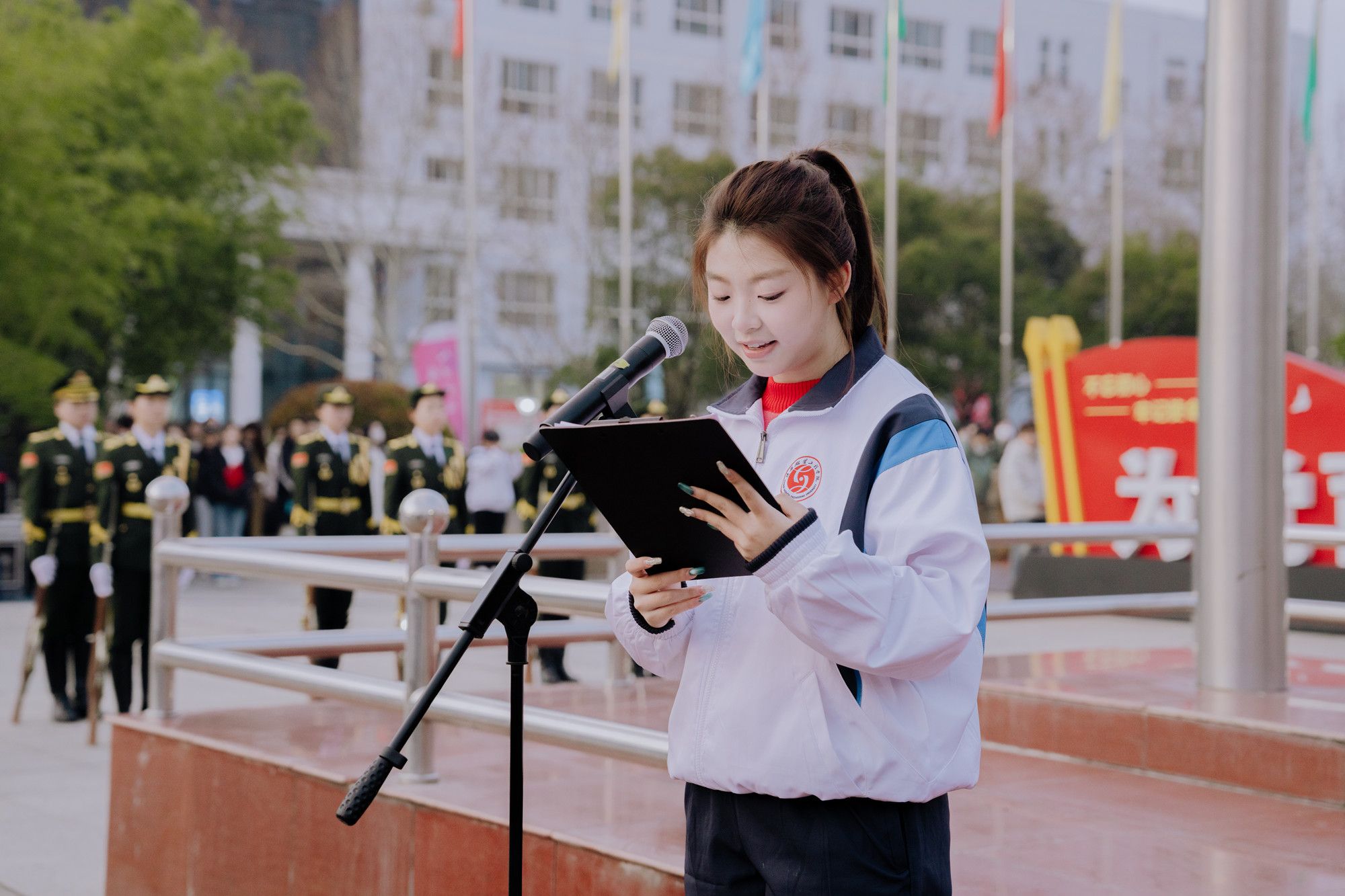应用技术学院学生张梓萌同学作了国旗下的演讲,呼吁全体师生收心归位,迅速切换至学习模式,以雷锋精神砥砺前行,爱校荣校,以主人翁姿态讲好校园故事,万人同心同德,共同擦亮学校品牌,开启高质量发展新征程。应用技术学院学生的集体诗歌朗诵《青春向国旗,奋楫新征程》,以青春之声展现了广大学子众志成城、奋楫争先的坚定信念。
