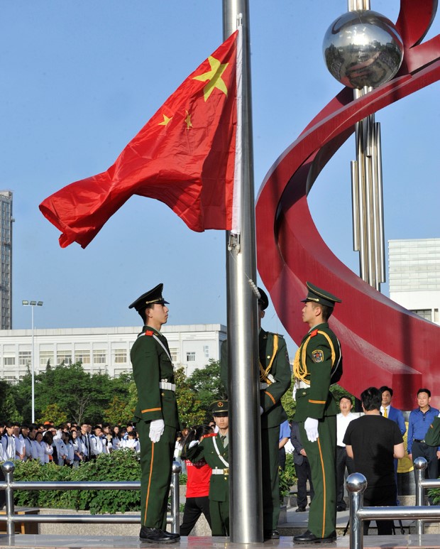 胡鸿晓主持。一声令下,英姿飒爽的国旗护卫队员护送鲜艳的五星红旗进场。在庄严的《国歌》声中,五星红旗冉冉升起,迎风飘扬。现场的每一个人向国旗行注目礼,表达对祖国无限的热爱和崇高的敬意。