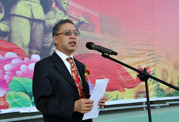 修葺一新的田径场秋雨后绿草如茵,场内彩旗猎猎,歌声飞扬;巨大的会标竖立在主席台正中,几十盆鲜花鲜艳夺目;主席台对面“励志践行”“笃学求实创新”十个大字熠熠生辉;主席台两侧十个红色气球载着大幅标语迎风飞舞。由近4000名2015级新生组成的36个方队整齐的列队在田径场内,怀着喜悦的心情期待检阅,6000多名12、13、14级学生和全体教职工坐满了看台,共迎新的学年。