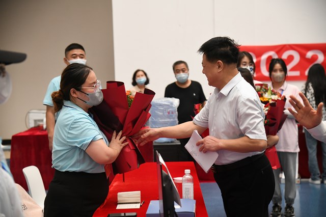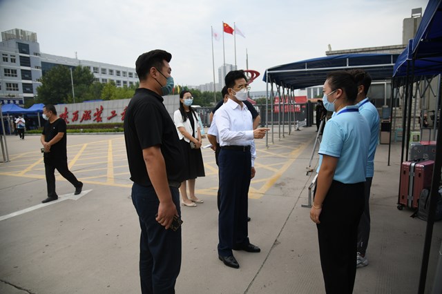 董事长一行检查了迎新接待工作。亲切与工作人员握手,表达学校的慰问,感谢工作人员的优秀工作,高度肯定招生接待工作。